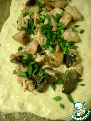 Можно чуть припылить дно пирога крахмалом и выложить рыбную начинку. Посолить и поперчить по вкусу. Сверху посыпать зеленым луком. -
