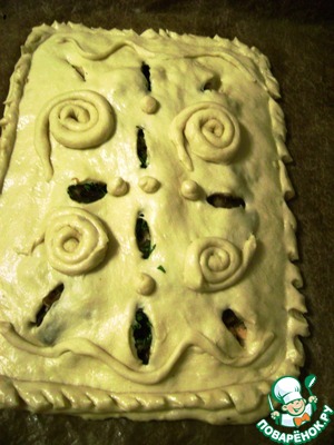 Украсить пирог. Непременно сделать проколы-разрезы для выхода пара. Дать расстояться, смазать чем любите, и выпекать при 200 градусах до легкого румянца. Затем снизить нагрев до 180 и печь до готовности.