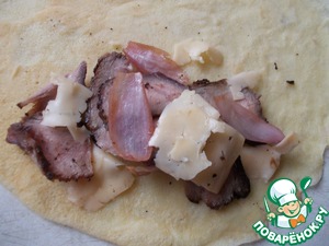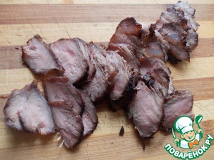 Кусочек мяса (вес не принципиален, можно взять побольше) Замариновать в специях, соли и ложке кефира. Запечь при 200С. около получаса. Можно использовать мясо с гриля, шашлык или ветчину. Когда немного остынет, порезать тонкими пластинками.