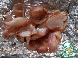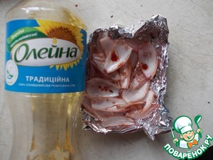 Лук почистить и разделить на пластинки. Из фольги сделать конвертик и налить туда масло и бальзамик, перемешать с луком и можно запекать вместе с мясом, до мягкости. Не зажаривайте, поэтому нужно посматривать периодически.