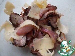Смешиваем лук с мясом и сыром, который мы предварительно порезали с помошью овощечистки.