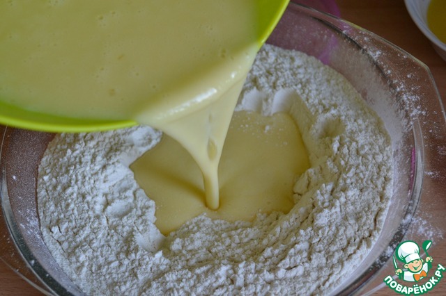 Просейте 500 грамм муки, сделайте углубление в центре, влейте яичную смесь в муку. -