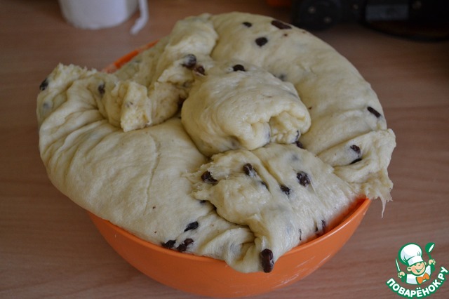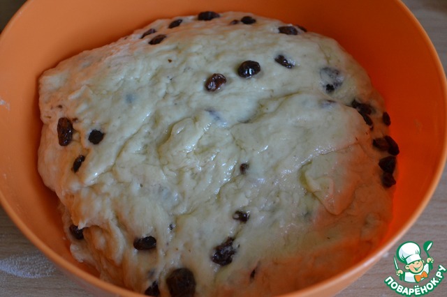 Добавьте изюм. Уберите тесто в теплое место на час-полтора.