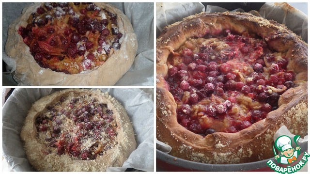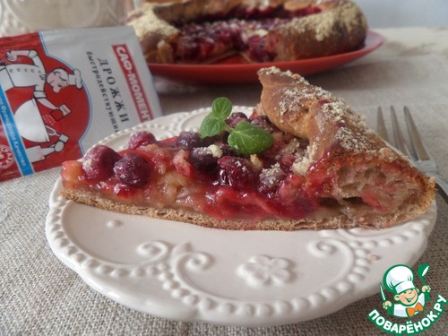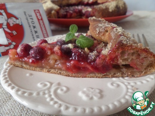 • Тесто раскатываем в лепешку и кладем в форму. Посыпаем крахмально- сахарной смесью и выкладываем яблоки. Затем сахар с крахмалом и клюква, которую присыпаем крахмально-сахарной смесью.