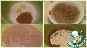 • В чашку выкладываем йогурт, 2 желтка, 4 ст. л. сахара и соль. Перемешиваем. Подогреваем молоко и добавляем какао-порошок. Маргарин растапливаем в микроволновке. Молоко с какао и маргарин добавляем к йогуртовой массе. Хорошо перемешиваем.