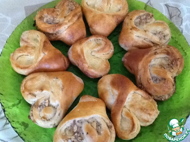 Сложить пополам, края защипнуть и немного подвернуть во внутрь, чтобы форма плюшки была ровненьким сердечком.