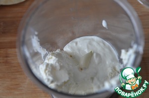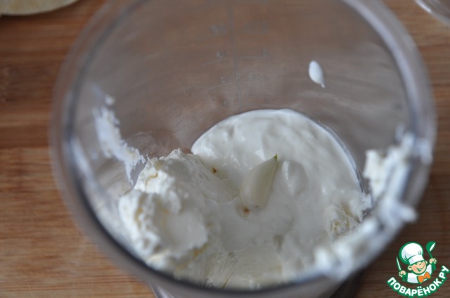 В чашу блендера кладём творожный сыр, сметану, чеснок, лимонный сок.