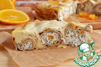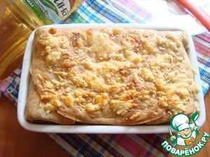 Смазываем верх масляной кисточкой и присыпаем пирог натёртым сыром. Ставим в духовку на 15 минут при т-180С.