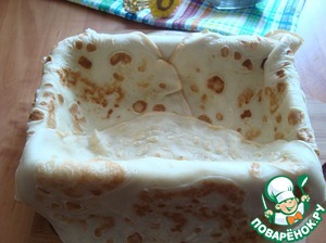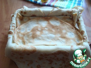 Выкладываем 4 блина так, чтобы концы свисали, а они должны свисать так, чтобы потом хорошо закрыли верх пирога и дно, чтобы было застелено.