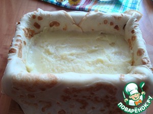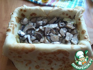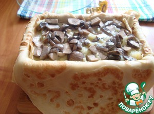 У нас остался пятый блин и вот его мы выкладываем после грибов, примерно посередине заполненной формы. Блин этот я всегда разрезаю пополам и прямыми концами выкладываю по стенкам формы.