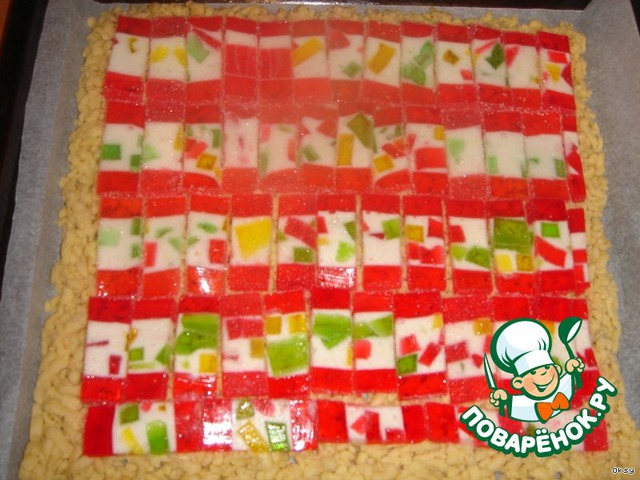 Выложить начинку, не доходя до краев. Я в этот раз делала с мармеладом. Немного пожалела, так как мармелад в некоторых местах вытек.