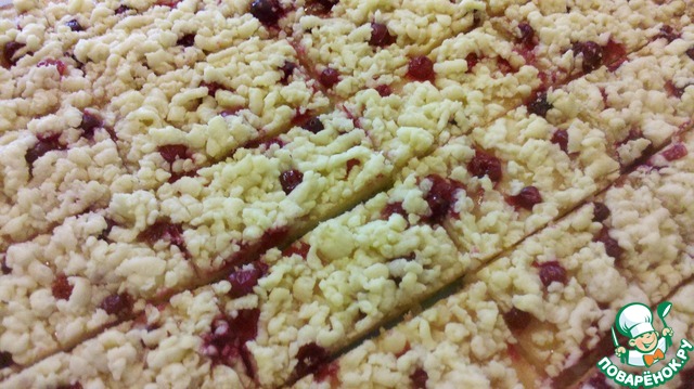 Когда тесто достаточно охладится, натереть на крупной терке на противень 2 части. Утрамбовывать не стоит, просто натрите ровным слоем.