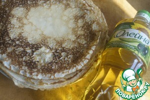 На хорошо разогретой сковороде, смазанной тонким слоем подсолнечного масла, выпечь тоненькие блинчики. Сложить стопкой.