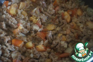 мелко порезать лук и обжарить на разогретой сковороде с подсолнечным маслом. Затем добавить фарш, хорошо перемешать разбивая комочки, обжарить в течении 7-10 минут.