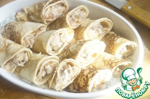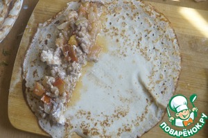 • На край блинчика выложить немного начинки, свернуть в плотную трубочку.