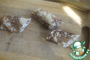 • Каждый блин с начинкой нарезать по косой на 3 части.