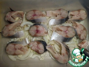 Выкладываем первый слой рыбы на лук (всего 2). -