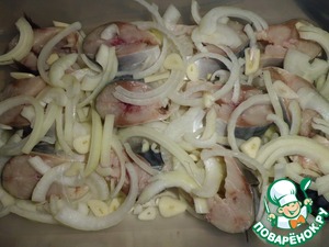 Засыпаем второй частью лука и чеснока и выкладываем сверху остальную рыбу.