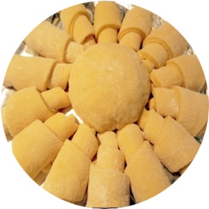 Из четвертой части теста раскатать пласт, толщиной 4 мм, свернуть в трубочку и разрезать на части, маленькие рулетики длиной 1,5 см. -