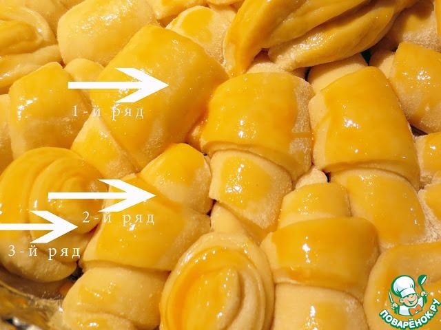 Круглую форму застелить бумагой для выпечки. В середину формы положить колобок, вокруг него, не плотно друг к другу первый ряд рулетов