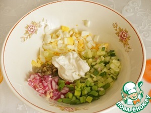 А теперь полет фантазии. На большую тарелку выкладываем небольшими кучками (или кто как сумеет) яйца, красный маринованный лук, свежие огурцы.