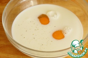 Смешать молоко с яйцами, сахаром и солью. Удобно это делать погружным блендером.