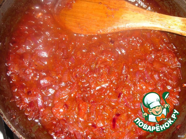После того, как томаты слегка обжарятся с луком, добавить соус "Наршараб" и вино. По идее, здесь необходимо сухое красное вино. Но у меня оказалось только красное полусладкое, да еще и с добавками (корица, гвоздика), эдакий заводской глинтвейн. Его я и добавила. И не зря, так как гвоздика с корицей только добавили пикантности. Поэтому при использовании сухого вина добавьте чуть-чуть сахара и пряностей. Соус нужно держать на огне, периодически помешивая, довести до сгущения. Незадолго до окончания готовки, соус поперчить и посолить по вкусу. -