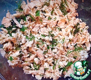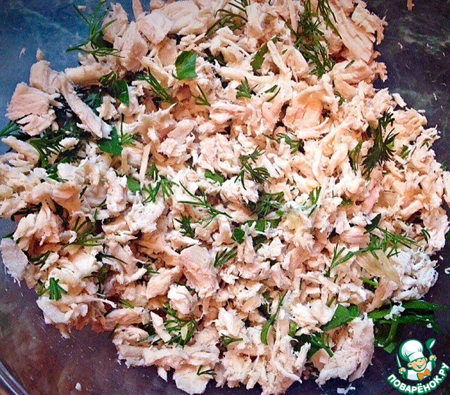 Осталось только приготовить начинки, как я писала ранее, делаю их накануне вечером. Начнем с куриной. Курицу отварить, нарезать мелко, смешать с зеленью. Бульон оставить, он нам еще пригодится.