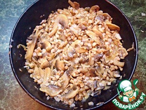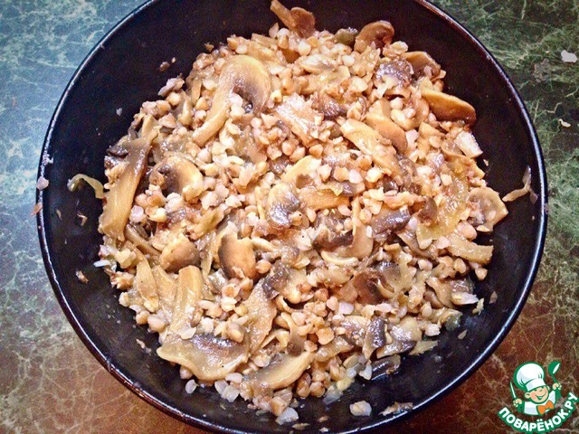 Теперь грибная начинка. Грибы обжарить с луком. Гречку отварить в курином бульоне, смешать с грибами и луком. если вы гречку будете варить в воде, то не забудьте посолить, у меня бульон уже был достаточно соленый.