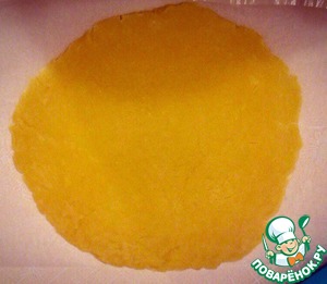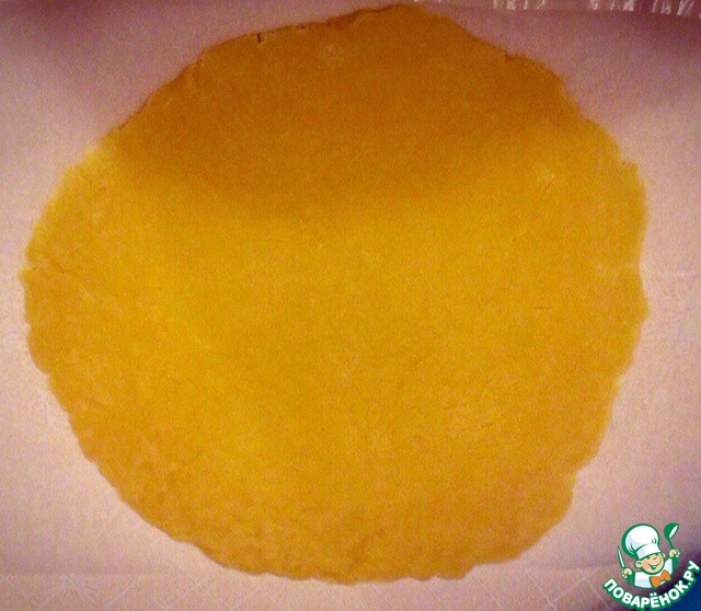 Песочное тесто делим на две части, одна чуть больше другой. Меньшую часть тонко раскатываем в круг, делать это надо сразу на пергаменте, присыпав мукой. -