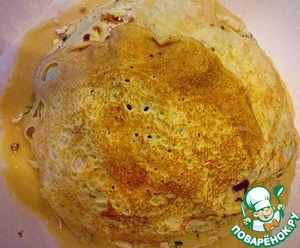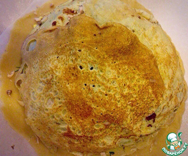 Выкладываем на тесто блин, сверху куриную начинку, опять блин, грибную начинку, блин, яичную начинку, блин. Я вот сверху два блинчика положила.