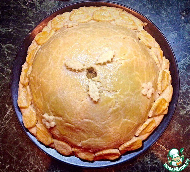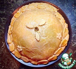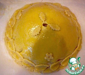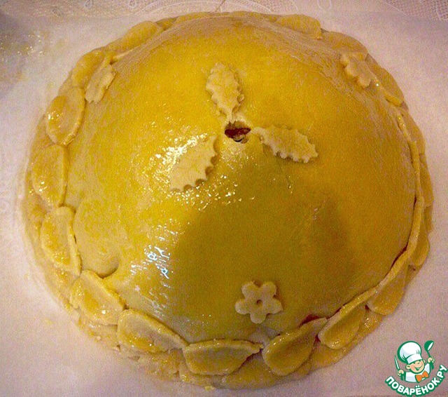 Накрываем сверху раскатанной второй частью теста, в центре делаем отверстие, смазываем яичным желтком, украшаем по желанию.