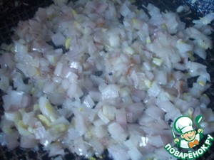 Наливаем масло в сковороду и отправляем туда порезанный мелко лук. Доводим до прозрачности, периодически помешивая.