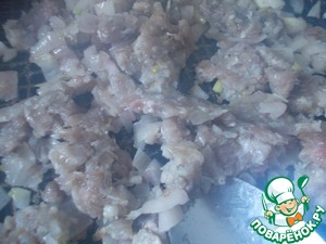 Затем отправляем фарш и немного обжариваем, солим и перчим.