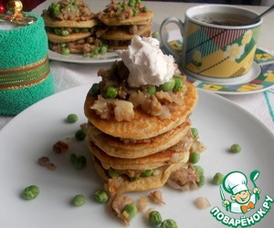 Каждый оладушек перекладываем начинкой в стопочку. Подаем к столу горячими. Приятного аппетита!