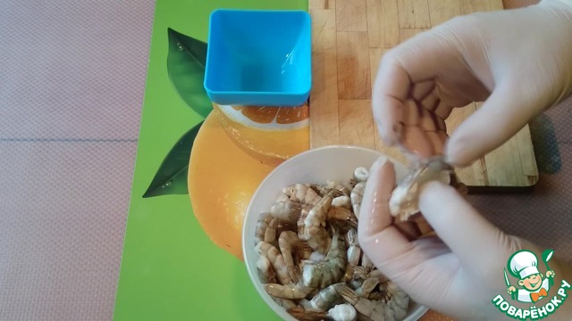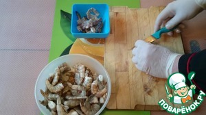 Размораживаем креветки и приступаем чистить. Первый способ с помощью ножниц. Углубляемся ножницами вглубь креветки и надрезаем панцирь. Чистим и удаляем пищевод.