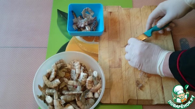 Затем надрезаем оставшиеся креветки, оставляя хвостики, и промываем под холодной водой.