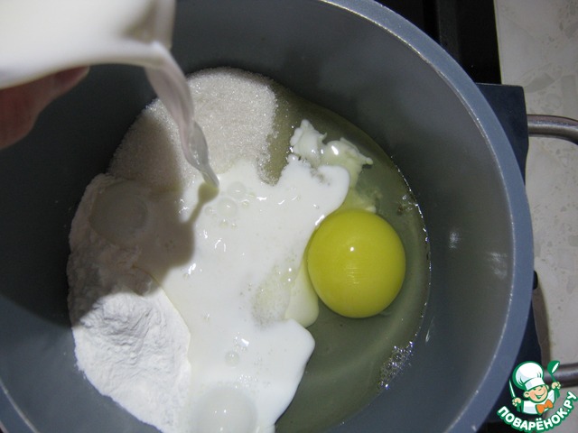 Пока тесто подходит, приготовить крем. В толстостенную кастрюлю положить яйцо, сахар, крахмал, влить молоко. Поставить на огонь, постоянно помешивая.