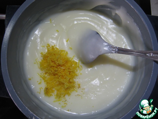 Когда крем начнет густеть, добавить цедру и ванилин. Когда появятся бульки, снять с огня.