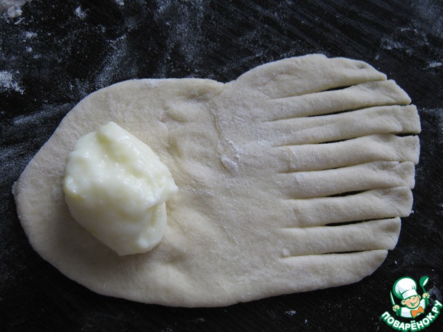 Раскатать каждую в овал, на одну сторону которого выложить примерно 1 ст. л. крема. Другую сторону надрезать полосками.
