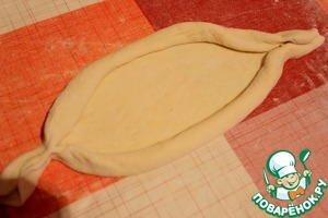Когда тесто поднялось, разделить на 4 части, раскатать очень тонко и придать овальную, продолговатую форму. Края свернуть, создать т. н. бортики и придать форму "лодочки". В середину выложить начинку и запекать до готовности в заранее согретой духовке, Выпекать при максимально высокой температуре. (10-15 минут) -