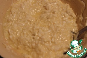 400 г сыра натереть на терке, смешать с 2 яйцами, добавить 400 мл воды и 6 ст. ложки муки. Хорошо перемешать.