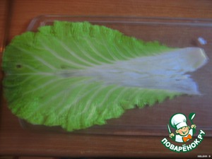 Толкушкой отбиваем толстую часть капустного листа и помещаем по 2 листа в микроволновку для того, чтобы они стали мягче (буквально на 1/2 минуты)...