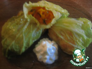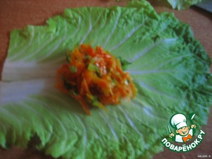Выкладываем нашу начинку на капустные листы и заворачиваем в конвертики
