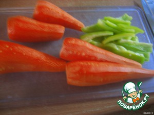 Мелко режем перец и трём морковь - всё обжариваем на растительном масле, после добавляем лук и приправу по вкусу