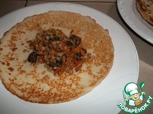 Начинка: Заранее отварить гречку, для начинки понадобится 1стакан, грибы, если нужно, предварительно отварить, у меня замороженные шампиньоны, я не отваривала. Морковь натереть на терке. Нарезанные грибы поджарить на сливочном масле, добавить морковь, потушить до готовности, добавить гречку, прованские травы, соль по вкусу. Начинка для блинов готова.