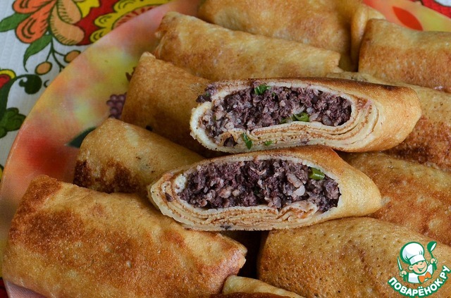 Очень просто рецепт блинчиков, но в тоже время очень вкусный. Помню его из детства, как бабушка готовила огромную стопку блинов, а потом крутила то с печенью, то с мясом или легкими, а иногда смешивала начинки. Блинчики я пекла по рецепту, который уже публиковала, на кефире и кипятке, но вы можете взять любой рецептик. Лучше подавать со сметанкой или со сливками. Угощайтесь!