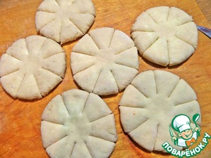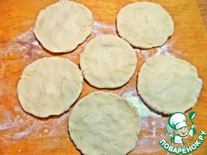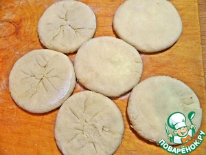 Скатать каждый кусочек в шарик. Расплющить руками. Мои кружочки 10 см в диаметре.