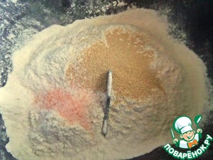 Опять доверим замесить тесто хлебопечке. Всыпаем в чашу муку, дрожжи, соль.