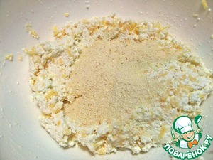 Соединить с творогом из пачки и белком. Можно и целое яйцо добавить, но у меня остался белок от предыдущего рецепта: http://www.povarenok .ru/recipes/show/122 863